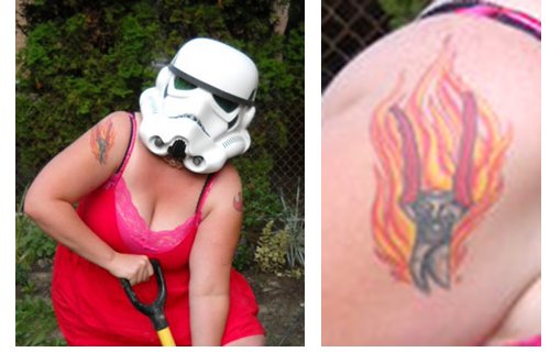But I want to add one more thing….she has the coolest tattoo I have ever seen…I have to confess tattoo envy. Basically, I like to think I would get one, but I simply don’t have the nerve. Yeah, I say maybe I will get a tattoo (like for my 40th birthday or something) but bottom line: I am all talk. I won’t probably do it….but if I did, it would be behind my ear (where I am sure it would hurt like hell) but would never be as awesome as a pair of flaming secateurs.