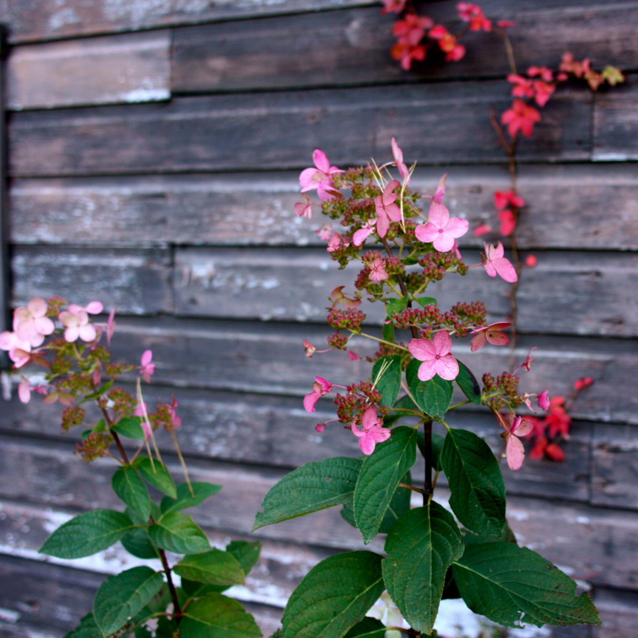 And then there is the hydrangea (whose variety I can’t remember) with flowers I thought were supposed to be all pink — but it turns out it opens white and fades to a pretty autumn mauve.