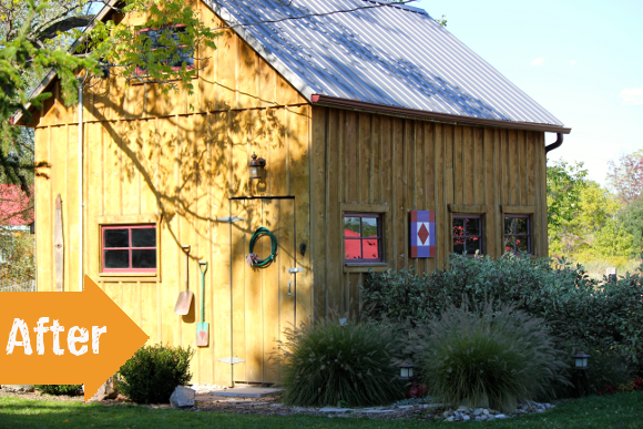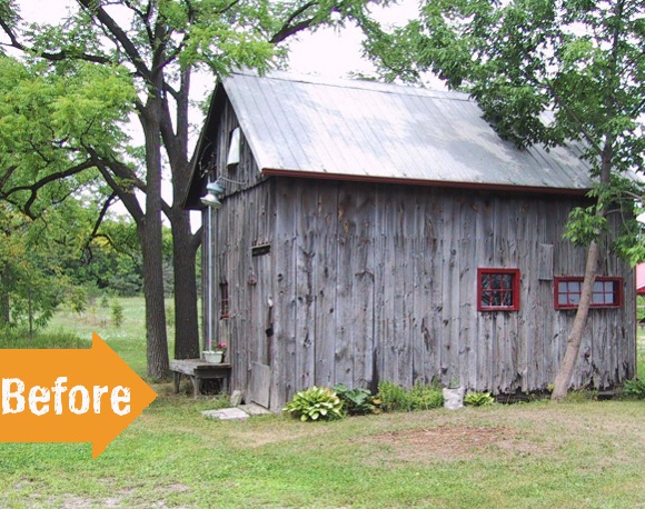 When I found this awesome shed makeover last week I knew you guys were going to love it. I’ve always held a special place in my heart for sheds…I think it’s because they’re pretty much like forts for adults. And really, who doesn’t want their own fort to escape to on hot summer days? And since I don’t have a shed [fort?] of my own yet, I like to live vicariously through those who do. The before photo features the original shed which definitely held it’s own in the department of rustic charm. But Diane’s beautifully remodeled shed is a real showstopper.