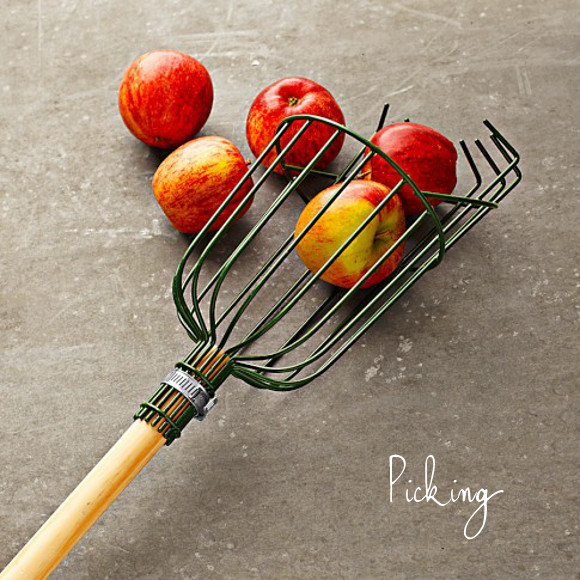 The apple trees that I planted a of couple years ago actually gave us a six-pack of fruit last fall. The apple picker might still be premature (by a at least a couple of years), but what gardener can resist being this optimistic?