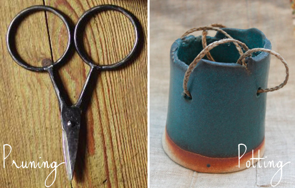 Images: Tub Trugs from The New General Store, Apron from Fog Linen, Apple picker and Vintage Planter and Stand from Williams Sonoma, Scissors from The New General Store, and Hanging ceramic pot from Alder and Co.