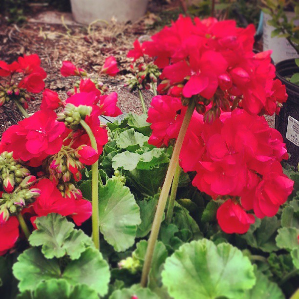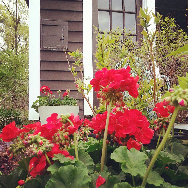 I have roughly 8-9 pots that I plant up each year and often I match up a few and then do something different for others as they are moved around the garden. Wanting to get in and out of the nursery as quickly as possible though, I found myself honing in on a simple old standby – red geraniums. All the planters (with the exception of one that is already filled with rosemary) are getting overflowing mounds of red geraniums. They will carry me right through the summer with style and all I have to do is pinch back the blooms every so often.