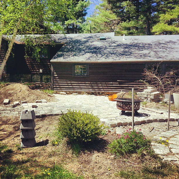 You might remember a post from last fall when we broke ground ( I wish I could find it!). But here is where we are today. The cobbles are almost all in (with the exception of the step) — they settled over the winter and need a little finessing….soon we will put in the polymeric sand to lock them in tight and then we will move on to build the pergola over the top. More to come….