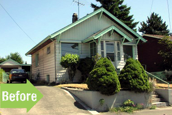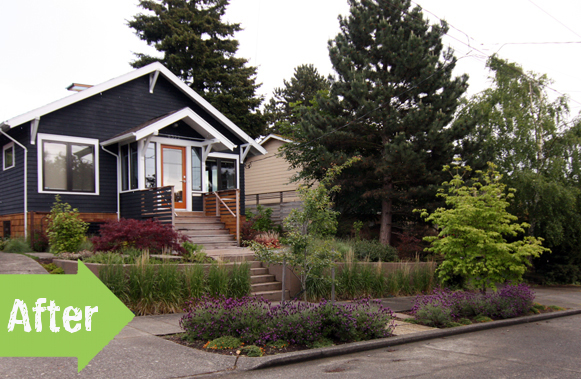 The nice thing about this is how they left the basic footprint. Lots of grunt work taking out overgrown plants, but notice the steps and retaining wall remained the same. Same for the house, just some update to the porch and new paint. Good savings on time energy and resources, with overall gain. Great vision!