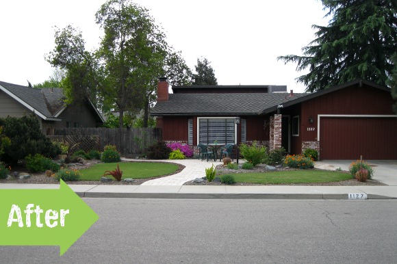 Spurred by the loss of a beautiful 25 year old peach tree, Debbie and her husband took the opportunity to turn their front yard into something that offered easy access to the front door as well as better curb appeal. The timing for grass removal couldn’t have been better with the city’s new water meters that were going in, and although I’m always sad when a mature tree dies suddenly, I think these guys definitely made the best of it. The new yard is wonderfully inviting and makes the house feel much more open and welcoming. Oh! And I even noticed the neighbors painted their exterior as well…bonus! Thanks so much for the email, Debbie! The house is looking great. -erin