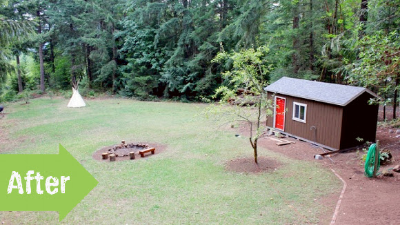 The couple saw potential in their new yard and knew that it was perfect for a tiny campsite. They got to work right away…branches were chosen for the tipi and a small guest house was built and painted. They tidied up the fire pit area and split lots of wood for fires. Of course, there were a lot of other things they did in order to bring the yard to life, although Kristina says that they still have a lot of work to do. But for now, I think things are looking great! Nice job Kristina!