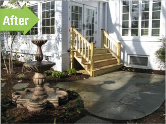 The newly installed stairs leading down to the stone patio adds even more character to this already gorgeous house, and I think the fountain really pulls it all together. I especially like the fact that the area now serves an actual purpose rather than just something to look at. If you want to see more projects from these guys, check out their website! -erin