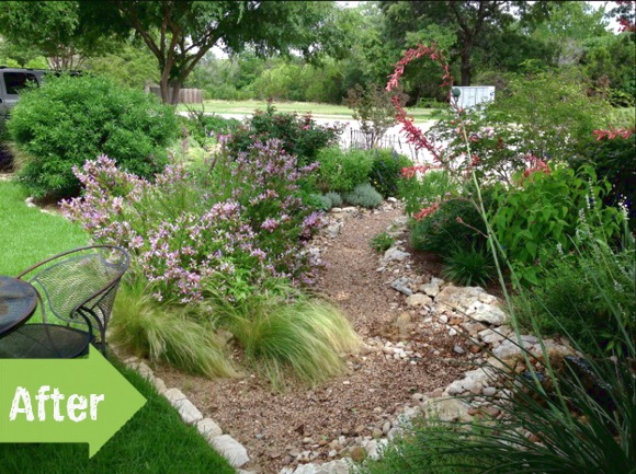 This is a great transformation, not only in appearance but also in function. It seems this intervention functions as a rain garden / bio-swale which reduces stormwater runoff from the property. Beautifully done!