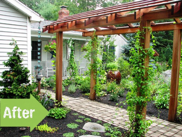 After yanking most of the existing shrubs and plants and the surrounding corner fence, the yard was ready to embrace a new design. A beautiful Mahogany arbor was built over the brand new path and lots of new plants were placed. A few other improvements were made as well- a large ceramic urn was fitted with a pump to circulate water and a huge faux rock was brought in to hide existing pipes. A really nice makeover- you should check out the rest of the photos over here! It’s definitely worth a visit. -erin