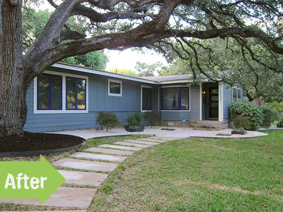 ranch, yard, path, front yard, makeoverFor this week’s Before & After I have a lovely front yard transformation that I found over at Foodie is the New Forty. This sweet little ranch house begged for a yard that would make its mid century-esque exterior sing, but the homeowners knew it was going to take a lot of hard work and a hefty budget, as well as the help of a landscaping crew. Optimista (which is the moniker she goes by on her blog) was tired of the weeds and general frump-factor radiating from the exterior of the house, so she decided it was finally time and enlisted the help of Dearen Landscapes.