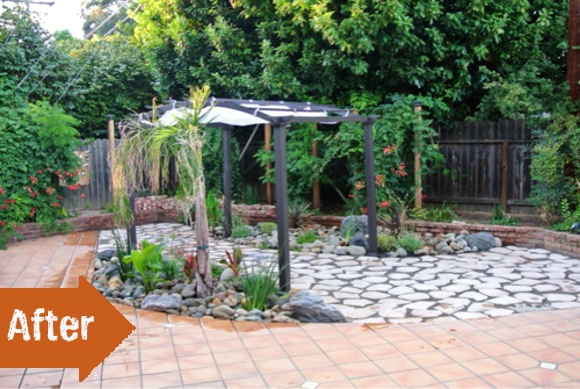 I always appreciate the thought that goes into all these great makeovers we feature on Studio ‘g’, but some of my favorites are the ones that add beauty and function. Tandra and Eric live in Sacramento, California, and they were faced with a yard that just wasn’t working for them. What was supposed to be a nice, grassy space for their dogs to hang out turned into an island of crunchy patchy grass filled with more than ample amounts of sunshine. They finally had enough and decided to create something they could enjoy.