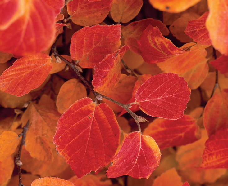Our plant is nestled under a deciduous larch that provides afternoon shade for the shrub. This fothergilla is a hybrid between the large Fothergilla major and the small Fothergilla gardenii. One of the first cultivars from this cross was Fothergilla x intermedia ‘Mt. Airy,’ which was introduced by Dr. Michael Dirr. Then, Gary Handy from Handy Nursery in Oregon found a branch sport of Mt. Airy with the intense blue color we now know as Blue Shadow.outstanding scarlet