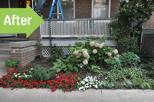 Wow! The small space filled up fast, and the bright red impatiens took off like rockets! Everything else looks great, too. Like I said, just a simple Before & After post today, but I always find it fascinating to see how plants grow so quickly.