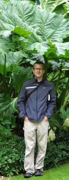 (To the right – Rodney and Mature Giant Gunnera that is easily 10-12 feet tall with deeply lobed leaves)
